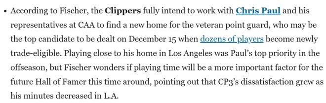 Fischer表示,快船方面计划全力配合保罗及其在CAA经纪公司的团队,为这位老将控卫寻找新东家。6天后,也就是北京时间12月16日,将有数十名球员解锁交易资格,保罗预计会成为届时头号被交易人选。